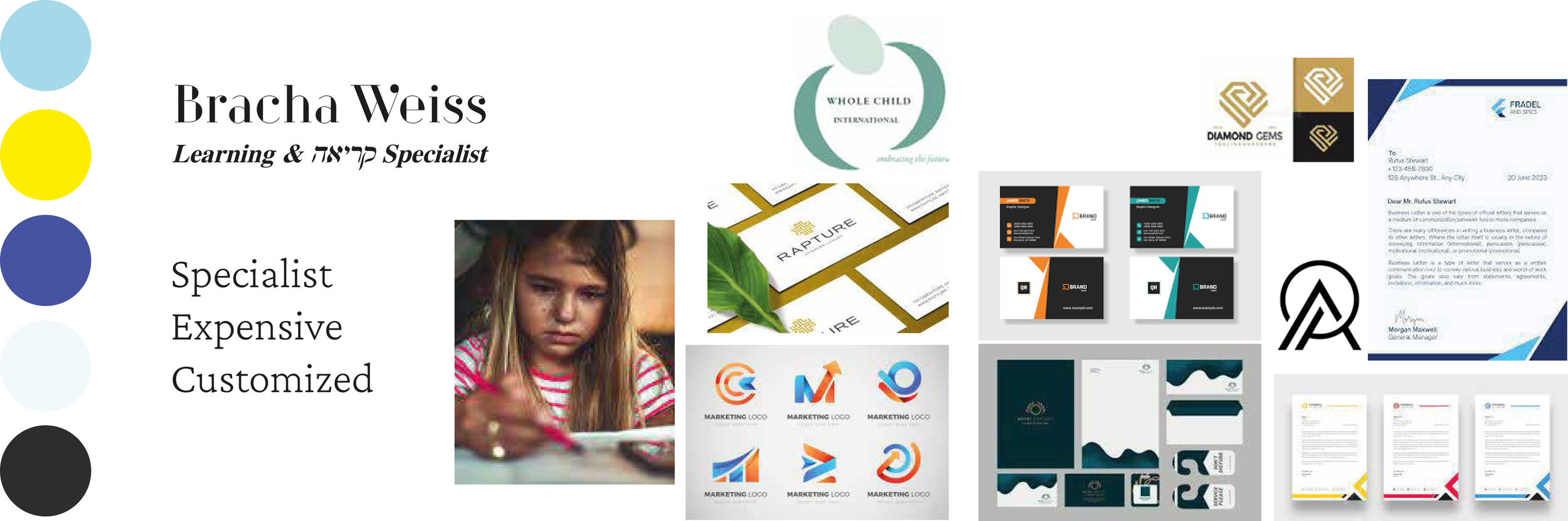 The final brand identity for Bracha Weiss emerged as a sophisticated and welcoming representation of her specialized services. The logo, with its clever integration of initials and child imagery, became a unique identifier for Bracha's holistic approach to learning and kriah.